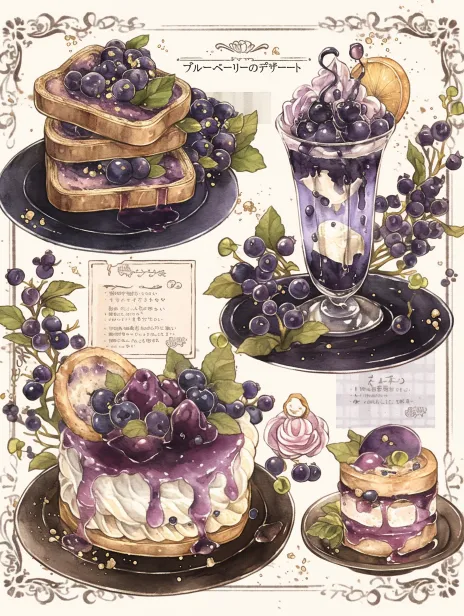 Midjourney Bot 更新时间:2026-02-22 00:22日式手绘水彩风甜品菜单插画,高浓度水彩肌理质感,晕染笔触明显,上方是流心蓝莓吐司(淋紫酱、点缀蓝莓,放黑盘+紫格餐布),;下方是三款小甜品:蓝莓三色蛋糕、蓝莓司康、蓝莓奶油蛋糕(带可爱表情),并标注日文“ブルーベリーのデザート”和中文描述。边框带精致花纹,文字描述,超精细刻画。 --ar 3:4 --style raw --stylize 400 --niji 6