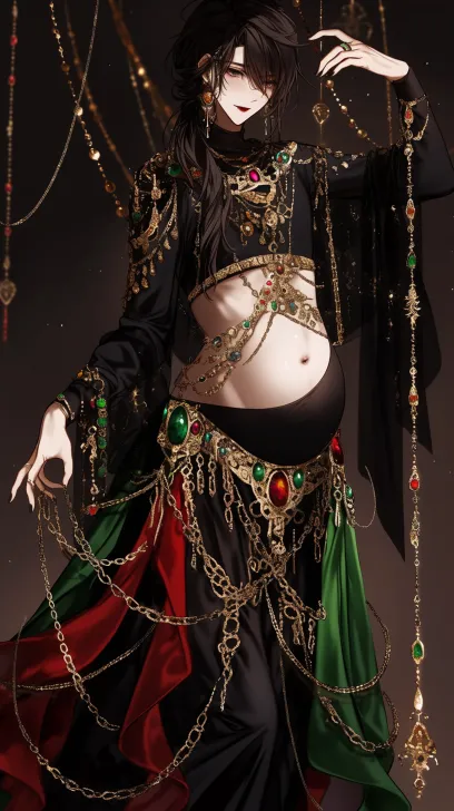 Midjourney Bot 更新时间:2026-02-23 00:00动漫,怀孕,清晰,复杂细节,最好的质量,超精细,高细节 pixiv插画,画面8K清晰,暗色调,冷色调,日韩漫画风 格,贵族气质,冷漠,一个俊美动漫男人,穿着黑色肚皮舞服装,镶嵌宝石和链条,长裙和高领上衣,深色吉普赛核心服装,红、绿、金,时尚珠宝, --ar 9:16 --style raw --stylize 100 --niji 6 --no no