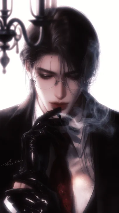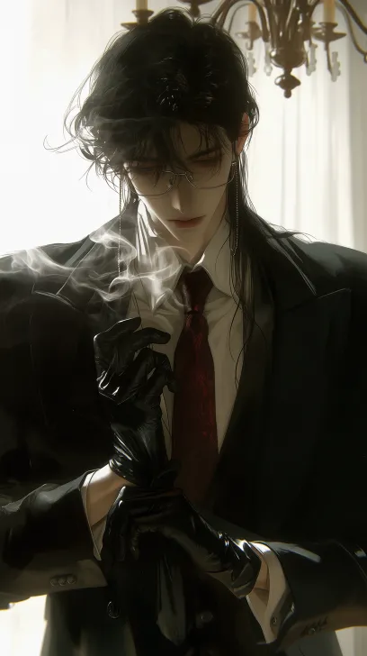 Midjourney Bot 更新时间:2026-02-22 00:11Masterpiece, best quality, 70s and 80s Hong Kong style, mature handsome man, gentleman elements, a handsome man with long messy black hair, wearing thin metal-framed glasses, dressed in a loose black suit, clean white shirt, and deep red patterned tie, one hand wearing a black leather glove. He looks down at his hands, one hand holding the other, with faint smoke swirling around his face. The shooting angle is low, looking straight at him, creating a strong yet mysterious feeling. The light is soft and hazy, with a chandelier in the background casting subtle shadows. The background is a minimalist pure white room. The overall style is dark, heavy, and exquisite, with a cinematic quality and slight graininess, reminiscent of still images in old movies. Exquisite makeup, deep-set eyes, commanding shadow, enchanting and cold, three-dimensional bone structure, delicate light and shadow, faux thick paint, Rembrandt backlight, image 8k ultra HD, faux BJD skin texture, father, uncle, dad. --ar 9:16 --stylize 200 --niji 7
