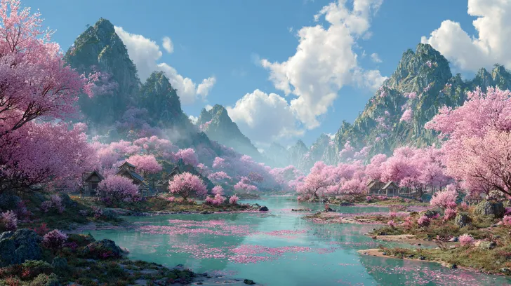 Midjourney Bot 更新时间:2026-02-22 00:18Chinese fantasy, thick realistic coating, cinematic composition, 16:9 wide width, high contrast light and shadow, misty clouds, celestial vision, game poster texture, 8K, ultra realistic, masterpiece, depth of field, atmospheric perspective, story atmosphere. A valley surrounded by mountains, isolated from the world. A clear stream meanders through, with pink peach blossom petals floating on the surface of the water. On both sides of the strait are dense peach forests, in full bloom, with trees and flowers blooming like pink clouds. There are several thatched cottages in the forest, and at the foot of the mountain in the distance, there is a lush green rice field that reflects the sky like a mirror. The sky is a clear light blue with a few strands of white clouds. The sunshine is bright, the light is warm and soft, and the air seems to smell the fragrance of flowers and soil. The atmosphere is peaceful, tranquil, and free from conflict with the world. --ar 16:9 --v 7 --stylize 100