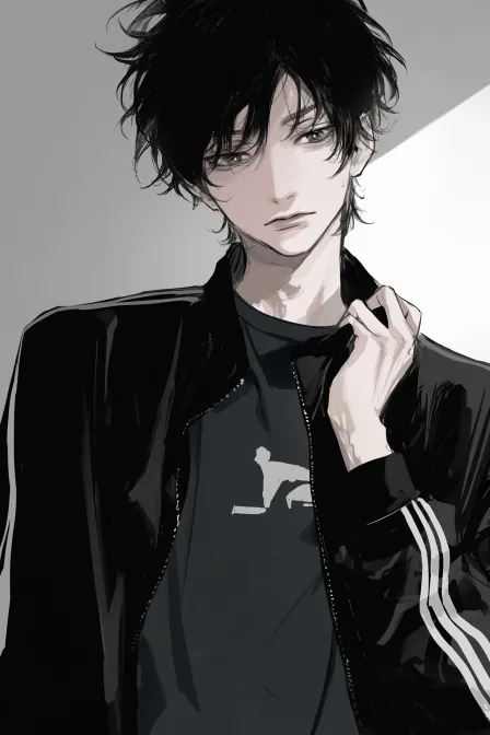 Midjourney Bot 更新时间:2026-02-22 00:21https://images.gogpt.vip/aigf/m_thumbnail/20260203/1771643/zv28kh04i99gti9j.webp A young man is wearing a black sports jacket, with a stylish and rebellious overall look. His hair presented a casual and messy feeling, with a simple white background, and one hand casually tugged at the collar --ar 2:3 --stylize 100 --iw 0.5 --niji 7 --sref https://images.gogpt.vip/aigf/m_origin/20250822/1771643/nv2dkr1rkx1ao9gn.jpg --sw 314 --no Don't wear glasses.