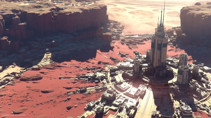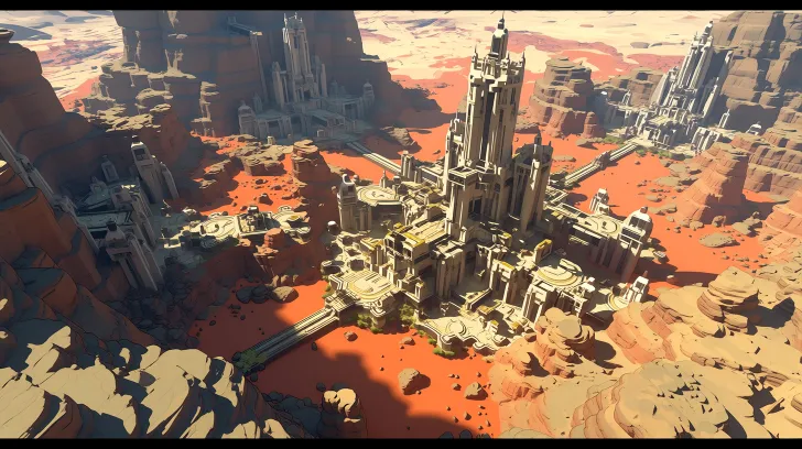 Midjourney Bot 更新时间:2026-02-22 00:00帮我生成一张未来世界的插画,人迹罕至,建筑物极少并且极小【2-3座】并且与自然地形相融合,建筑物不要太先进高级,可以借鉴各国的古建筑元素,红色风蚀地形,大块岩石与沙地裸露,视角:从天空俯视,视野宽阔色彩对比强,光照强,有明显的光影,整体色调略亮, --ar 16:9 --weird 261 --stylize 172 --niji 7 --sref https://resource.gogptai.com/aigf/origin/20260221/1771688691177815_3.png https://images.gogpt.vip/aigf/m_origin/20260221/2061540/p78fabm2rnaid62n.jpg --sw 32