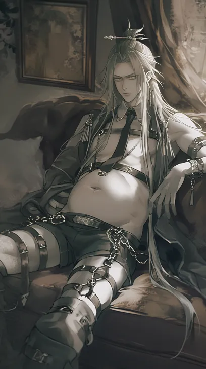 Midjourney Bot 更新时间:2026-02-22 00:00胶片感,颗粒感,氛围感,通透感,一个留着高发髻长发的俊美动漫男人,怀孕,慵懒,冷白皮,腹肌可见,,领带,腿带,harness,肩膀链,饰流苏点缀,坐在沙发上 --ar 9:16 --style raw --stylize 100 --niji 6 --no no