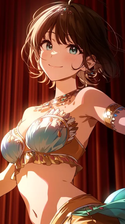 Midjourney Bot 更新时间:2026-02-22 00:02一个女生,深棕色色头发,丸子头盘发,墨绿色色眼睛,身穿华丽拉丁舞服饰,背景是酒馆的木质舞台后面是深红色的幕帘,动作:在舞台上起舞:脸上是无挑剔的笑颜,发丝微微凌乱,头上有头饰,平视视角,顶光,cg插画厚涂,高清渲染,8k画质,画面感强的厚涂质感(impasto),精细光影与阴影处理,淡色温暖主光配合冷色边缘补光,头发与眼睛的高光反射,柔和真实的皮肤质感, 清晰的面部细节,元素拆分设计,发色,打歌服装、 配饰采用明显的色块区分,明亮和谐的色调,动态略 偏离中心的构图,平视相机视角,浅景深人像面部为 焦点,带有细腻画布与笔触质感,高细节渲染,精修舞台灯光氛围,干净柔和的渐变背景,电影质感,CG 渲染,厚涂,超绝氛围感,杰作,漫画感,极致光 --ar 9:16 --stylize 100 --niji 7 --no 扭曲手指,男性,男性特征,穿模,粘合的四肢,高饱和度,比例不协调的五官