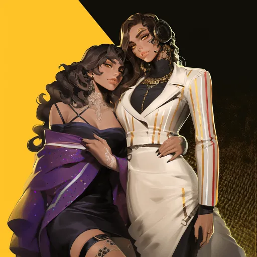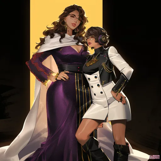 Midjourney Bot 更新时间:2026-02-22 00:11https://images.gogpt.vip/aigf/m_origin/20260222/804650/14xtxibyuvcgtqu3.png https://images.gogpt.vip/aigf/m_origin/20260221/804650/wdgtjzmsnk646f3u.png 游戏中的两位女性角色互动,动作亲昵贴近。高个女性拥有深棕色长卷发与金色挑染,佩戴眼镜,身着深紫色高开叉礼服,饰有红色蕾丝与珠链流苏,外搭白色蕾丝披肩;矮个女性拥有深棕色短卷发,身着白色双排扣短款西装、黑色高领内搭、白色百褶短裙与黑色靴子,颈部挂着耳机。矮个角色单膝微屈仰头凝视高个角色,一手搂着她,高个角色站立,一手搭在矮个角色的肩膀上。采用戏剧性暖调侧光,营造电影感氛围,高细节,丰富的面部表情,高饱和对比,潮流,时尚,艺术,强烈的色差,高饱和度的颜色,波点质感,波点效果,波点渐变,细腻的皮肤,夸张的动作,风格来自Alberto Mielgo --ar 1:1 --stylize 100 --iw 1.25 --niji 6 --sref https://images.gogpt.vip/aigf/m_thumbnail/20250713/804650/ytt0lp3yggjt30cv.webp https://images.gogpt.vip/aigf/m_origin/20241225/804650/b0jc1v8j7qq5nvjt.jpg --sw 77