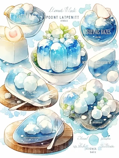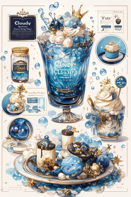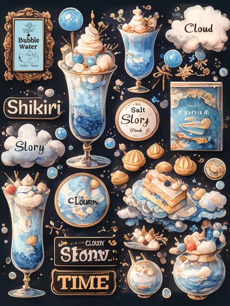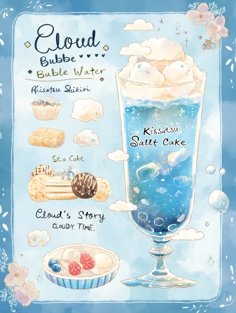 Midjourney Bot 更新时间:2026-02-22 00:04日式手绘水彩风甜品菜单插画,高浓度水彩肌理质感,晕染笔触明显,主题“云之气泡水”,浅蓝+奶白清新治愈色调,主体:渐变蓝色玻璃杯装气泡水(杯身日文“喫茶シキリ”,顶部云朵奶油+星星/皇冠/气泡)、右侧蓝白千层蛋糕(标注“海塩ケーキ”)、底部玻璃盘甜品拼盘(奶油+覆盆子+饼干+云朵棉花糖);辅助:左侧“雲の物語”竖排字+3个小插画,右上角“CLOUDY TIME”复古标签框;超精细刻画 --ar 2:3 --stylize 400 --niji 6