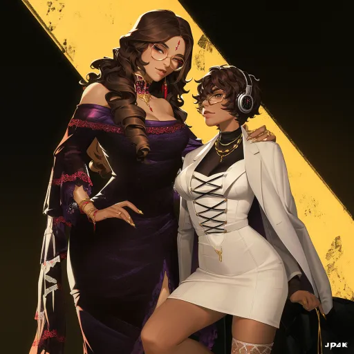 Midjourney Bot 更新时间:2026-02-22 00:03https://images.gogpt.vip/aigf/m_origin/20260221/804650/wdgtjzmsnk646f3u.png 游戏中的两位女性角色互动,动作亲昵贴近。高个女性拥有深棕色长卷发与金色挑染,佩戴眼镜,身着深紫色高开叉礼服,饰有红色蕾丝与珠链流苏,外搭白色蕾丝披肩;矮个女性拥有深棕色短卷发,身着白色双排扣短款西装、黑色高领内搭、白色百褶短裙与黑色靴子,颈部挂着耳机。矮个角色单膝微屈仰头凝视高个角色,一手搂着她,高个角色站立,一手搭在矮个角色的肩膀上。采用戏剧性暖调侧光,营造电影感氛围,高细节,丰富的面部表情,高饱和对比,潮流,时尚,艺术,强烈的色差,高饱和度的颜色,波点质感,波点效果,波点渐变,细腻的皮肤,夸张的动作,风格来自Alberto Mielgo --ar 1:1 --stylize 100 --iw 0.5 --niji 6 --sref https://images.gogpt.vip/aigf/m_thumbnail/20250713/804650/ytt0lp3yggjt30cv.webp https://images.gogpt.vip/aigf/m_origin/20241225/804650/b0jc1v8j7qq5nvjt.jpg --sw 77