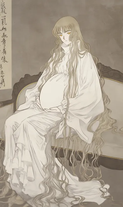 Midjourney Bot 更新时间:2026-02-22 00:08:CLAMP风格浮世绘,一个留着长发和金色刘海的男人,穿着睡裙叠戴oversized,怀孕,白色,淡色,透明感肌,清冷,静谧白,低饱和,雾感,冷白皮,坐在沙发上,正襟危坐, --ar 19:32 --style raw --stylize 100 --niji 6 --no no