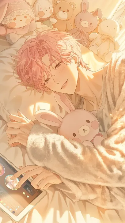 Midjourney Bot 更新时间:2026-02-22 00:09韩式半厚涂,cg质感,一位粉色长发少年,正慵懒地侧躺在柔软的米白色床品上。侧躺,他的发丝带着自然的微卷,随意地散落在枕间,几缕碎发轻贴在脸颊旁。他的皮肤是冷调的白皙,眉眼柔和,眼尾微微上挑,睫毛长,水润唇,眼神带着一丝慵懒的笑意,正温柔地看向镜头。他的唇色偏淡,嘴角勾起一抹浅浅的弧度,整个人散发出一种松弛又治愈的氛围。 他穿着一件宽松的绒毛卡通睡衣,露出线条干净的肩颈。他的左臂弯曲,将一只粉白相间的毛绒玩偶紧紧抱在怀里,玩偶的耳朵柔软地搭在他的手臂上。他的右手则自然地搭在身侧的平板电脑上,指尖轻触屏幕。 在他的身旁,还摆放着平板电脑上正播放着音乐,界面上显示着歌词和圆形的专辑封面。 在他的身后,床头整齐地摆放着一排毛绒玩具:有戴着蕾丝花边帽的浅粉色玩偶、系着蝴蝶结的小熊、垂耳兔,还有一只纯白色的长耳兔,它们都被柔软的床品包裹着,为整个画面增添了满满的温馨感。 暖黄色的光线从侧方洒落,在他的发丝和脸颊上投下柔和的光影,让整个场景显得格外静谧又治愈。 --ar 9:16 --stylize 100 --niji 7 --no Close