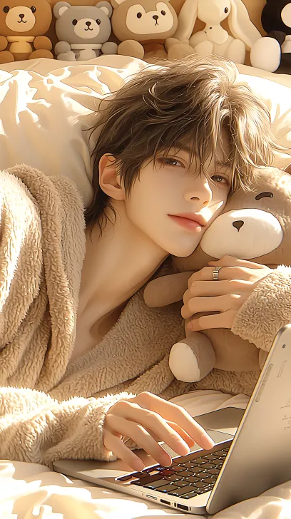 Midjourney Bot 更新时间:2026-02-22 00:09韩式半厚涂,cg质感,一位奶茶色长发少年,正慵懒地侧躺在柔软的米白色床品上。侧躺,他的发丝带着自然的微卷,随意地散落在枕间,几缕碎发轻贴在脸颊旁。他的皮肤是冷调的白皙,眉眼柔和,眼尾微微上挑,睫毛长,水润唇,眼神带着一丝慵懒的笑意,正温柔地看向镜头。他的唇色偏淡,嘴角勾起一抹浅浅的弧度,整个人散发出一种松弛又治愈的氛围。 他穿着一件宽松的咖啡色绒毛卡通睡衣,毛茸茸的,露出线条干净的肩颈。他的左臂弯曲,将一只棕白相间的毛绒玩偶紧紧抱在怀里,玩偶的耳朵柔软地搭在他的手臂上。他的右手则自然地搭在身侧的平板电脑上,指尖轻触屏幕。 还摆放着平板电脑上正放着小说界面,电子小说排版。 在他的身后,床头整齐地摆放着一排毛绒玩具:有浅棕色玩偶、浅灰的小象,白粉垂耳兔,还有一只纯白色的狐狸,黑白配色的熊猫,它们都被柔软的床品包裹着,为整个画面增添了满满的温馨感。 暖黄色的光线从侧方洒落,在他的发丝和脸颊上投下柔和的光影,让整个场景显得格外静谧又治愈。 --ar 9:16 --c 7 --weird 352 --stylize 1000 --niji 7 --no Close