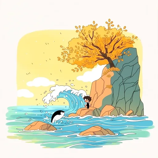 Midjourney Bot 更新时间:2026-02-21 00:22A boy stands on the rocky coast, with slightly bluer waters and white waves rolling up. Behind him, there is a golden cassia tree with small golden flowers on the cliff. A carp jumps out of the water, with a black back and a white belly. The carp must not have a red color. The carp is slightly smaller than the fish in the current picture, not too small, but also not larger in proportion to the boy. Hayao Miyazaki style, Makoto Shinkai style, color, watercolor texture, soft and dreamy light and shadow, blue, green, and gold tones, cinematic composition, fantasy atmosphere, detailed background, 4k, square. Similar to Hayao Miyazaki's style, soft watercolor paintings, warm golden sunset contrasting with cool blue seawater create a magical and hopeful atmosphere --ar 1:1 --stylize 100 --iw 2 --niji 7 --sref https://images.gogpt.vip/aigf/m_thumbnail/20260220/2060885/rl3dsdwhe1rwkbvd.webp --no Red