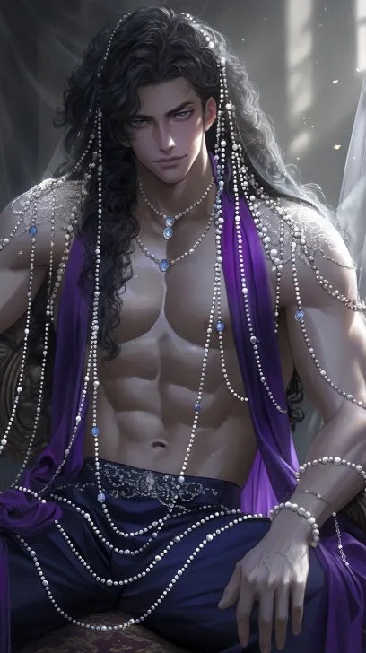 Midjourney Bot 更新时间:2026-02-21 00:2390s Japanese manga anime style, Ottoman Empire court aesthetics, a handsome anime man wearing a violet colored pearl satin lace pilgrimage cloth, silver beads and pearls hanging from his shoulders, inspired by silk, adorned with diamonds, and wearing a delicate veil on his face. The top is embroidered with white pearls, and each shoulder has a large number of bead decorations and silver bead tassels extending downwards from both sides. Golden thread, silver thread, fair skin, long curly black hair, muscular, soft light, sitting on a chair --ar 9:16 --style raw --stylize 100 --niji 6 --no no