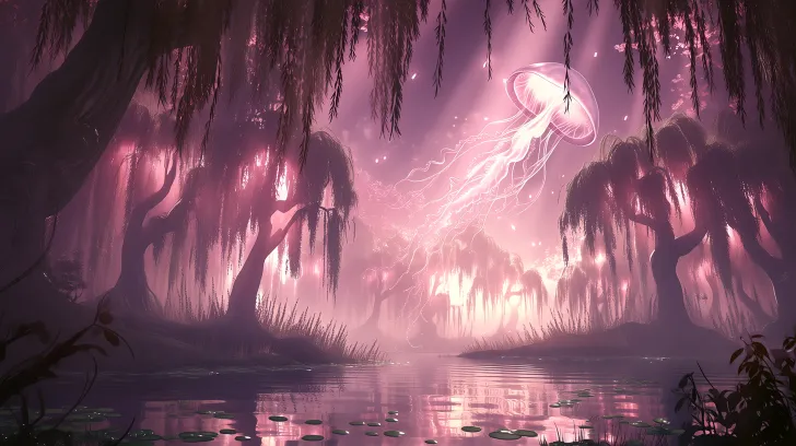 Midjourney Bot 更新时间:2026-02-22 00:07A huge transparent bioluminescent jellyfish flew over an ancient forest shrouded in mist, its tentacles transforming into willow branches. The forest floor was like a mirror reflecting the lake, with ethereal light, a masterpiece of surrealism, soft pink tones, 8K resolution, and cinematic composition --ar 16:9 --weird 208 --stylize 100 --niji 7