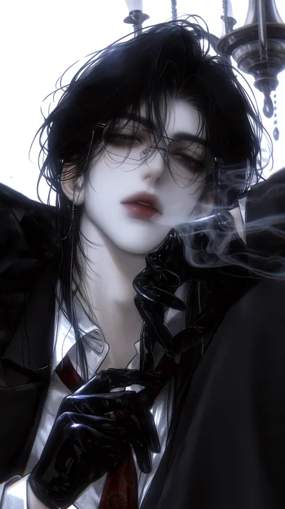 Midjourney Bot 更新时间:2026-02-22 00:08Masterpiece, best quality, 70s and 80s Hong Kong style, mature handsome man, gentleman elements, a handsome man with long messy black hair, wearing thin metal-framed glasses, dressed in a loose black suit, clean white shirt, and deep red patterned tie, one hand wearing a black leather glove. He looks down at his hands, one hand holding the other, with faint smoke swirling around his face. The shooting angle is low, looking straight at him, creating a strong yet mysterious feeling. The light is soft and hazy, with a chandelier in the background casting subtle shadows. The background is a minimalist pure white room. The overall style is dark, heavy, and exquisite, with a cinematic quality and slight graininess, reminiscent of still images in old movies. Exquisite makeup, deep-set eyes, commanding shadow, enchanting and cold, three-dimensional bone structure, delicate light and shadow, faux thick paint, Rembrandt backlight, image 8k ultra HD, faux BJD skin texture, father, uncle, dad. --ar 9:16 --stylize 200 --niji 7 --profile xe5id5h
