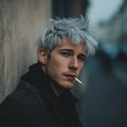 Midjourney Bot 更新时间:2026-02-22 00:09A young man with disheveled silver gray short hair, half leaning against a soft background, with a indifferent and hazy expression. He held a cigarette at the corner of his mouth, exuding a leisurely but slightly melancholic aura. The gaze was deep, and the slightly raised corners of the eyes added a touch of mystery. The overall color tone is cool and the background is blurry, emphasizing the delicate facial features and emotional depth of the character. The visual style has a delicate painting texture, showcasing a modern urban atmosphere. --ar 1:1 --v 7 --stylize 100
