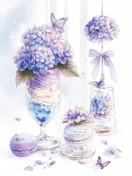 Midjourney Bot 更新时间:2026-02-21 00:16主体内容:盛放在玻璃高脚杯中的绣球花冰淇淋圣代,搭配丝带装饰;绣球花造型的马卡龙甜点;悬挂式玻璃风铃,内部装饰着淡紫色绣球花,下方系有丝带吊牌;插在玻璃罐中的单束蓝色绣球花,罐口系有丝带;装饰着绣球花、铜钱草和水晶的奶油蛋糕,旁边有蝴蝶点缀 风格参考: 清新治愈的水彩插画风格,融合日系少女心手账美学,线条柔和,晕染通透采用日本动画卡通风格。一幅精美的设计插画,为一本美食杂志封面设计,文字清晰。 --ar 3:4 --style raw --stylize 242 --niji 6