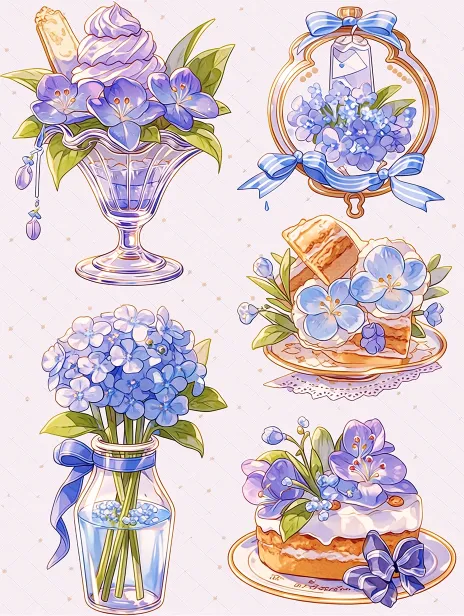 Midjourney Bot 更新时间:2026-02-21 00:16主体内容:盛放在玻璃高脚杯中的绣球花冰淇淋圣代,搭配丝带装饰;绣球花造型的马卡龙甜点;悬挂式玻璃风铃,内部装饰着淡紫色绣球花,下方系有丝带吊牌;插在玻璃罐中的单束蓝色绣球花,罐口系有丝带;装饰着绣球花、铜钱草和水晶的奶油蛋糕,旁边有蝴蝶点缀 风格参考: 清新治愈的水彩插画风格,融合日系少女心手账美学,线条柔和,晕染通透采用日本动画卡通风格。一幅精美的设计插画,为一本美食杂志封面设计,文字清晰。 --ar 3:4 --stylize 242 --niji 7
