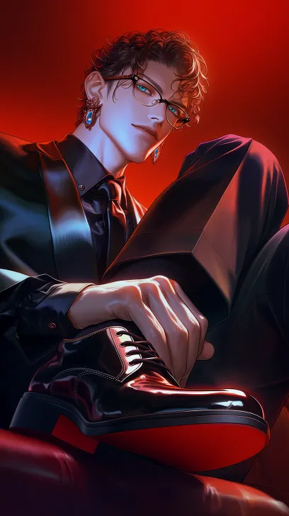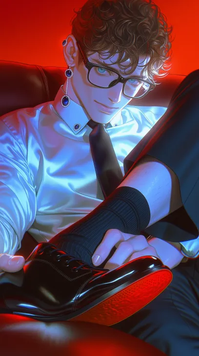 Midjourney Bot 更新时间:2026-02-21 00:19复古华丽氛围感人像摄影,近景特写构图,略微俯视视角,人物为俊美冷白皮青年,棕色卷发,湖蓝色琉璃光泽的眼睛,佩戴黑框眼镜与宝石耳饰,身着缎面白衬衫与黑色领结。 男性角色坐在沙发上,青年的头放在男性大腿上,双手轻握男性腿部,黑色西装裤子,黑袜子,黑皮鞋,红鞋底,作为前景元素。黑皮鞋红鞋底,踩在青年腿上。 背景为浓郁正红色,高饱和冷暖对比,丁达尔侧光打亮皮肤与缎面,营造细腻瓷肌质感与珍珠光泽,叠加复古胶片颗粒感与青蓝偏色滤镜,整体氛围暧昧、危险、华丽交织,充满老电影戏剧张力,8K高清,CG质感,厚涂油画肌理。 --zoom 1.5 --ar 9:16 --stylize 100 --niji 7 --no 仰头。女性头部。女性脸。