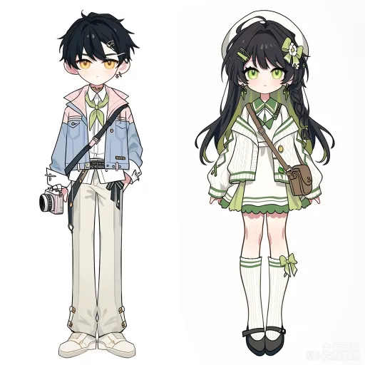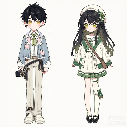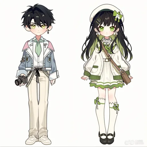Midjourney Bot 更新时间:2026-02-21 00:21https://images.gogpt.vip/aigf/m_origin/20260220/1686785/g76a8p9vplg0ctmo.png 左侧:浅蓝清新春日少年风服设 整体风格 以浅蓝、白、绿为主调,融合牛仔外套、与领巾元素,营造出清新温柔的春日少年气质,像是带着相机记录风景的温柔少年。 头部与发型 黑色短发,耳间点缀耳钉,金黄色眼眸增添了几分清冷又温柔的少年感。 上衣细节 - 内搭:白色衬衫,系着浅绿色领巾,层次分明。 - 外层:浅蓝和粉色拼接短款外套,有立体口袋腰间系着黑色绑带,袖口有白色拼接,既保留了休闲感,又注入了春日清新细节。 下装细节 白色长裤,裤脚带有金属纽扣,搭配白色厚底鞋,整体利落又充满活力。 右侧:白绿温柔学院少女风服设 整体风格 以白、绿为主调,融合贝雷帽、针织开衫与连衣裙元素,营造出温柔精致的春日少女气质,像是漫步在校园里的温柔少女。 头部与发型 黑绿渐变长发,搭配白色贝雷帽(饰有绿色蝴蝶结与发夹),耳间佩戴耳饰,绿色眼眸增添了几分温柔与清新感。 上衣细节 - 主体:白拼色水手服连衣裙,裙边有绿色荷叶边,外搭白色和绿色拼接针织开衫(袖口与下摆为绿色边),挎棕色小包,既保留了学院感,又注入了精致细节。单边挎这一个学院包 下装细节 白色过膝袜(袜口饰有绿色蝴蝶结),搭配黑色玛丽珍鞋,复古又温柔,与整体风格完美融合。 --ar 1:1 --stylize 100 --iw 2 --niji 7