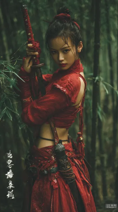 Midjourney Bot 更新时间:2026-02-21 00:21色彩艳丽,高饱和度,武侠电影预告片,顶级大片质感,竹林里的微透薄纱面料红衣红裙女侠手持一把造型酷炫的宝剑 --ar 9:16 --v 7 --stylize 150