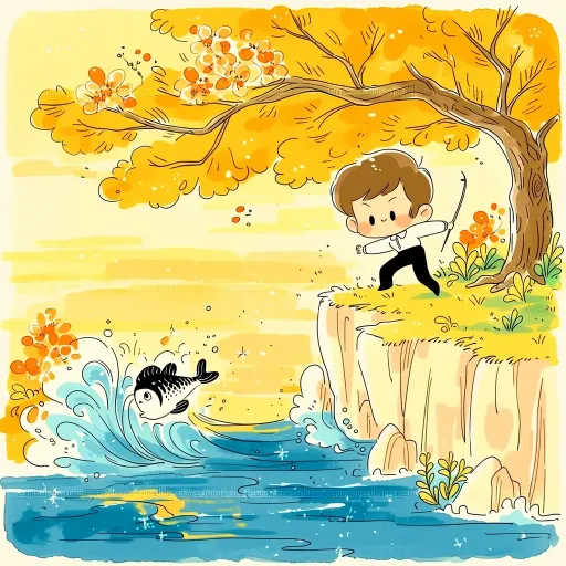 Midjourney Bot 更新时间:2026-02-21 00:13A young man with a determined expression stood on a cliff, at sunset, beside a golden cinnamon tree with glowing flowers, and a magical carp jumped from the blue waves below. The back is black, and the belly is white. Carps should not have a red color, as it can be slightly larger. Hayao Miyazaki style, soft watercolor painting, warm golden sunset contrasting with cool blue seawater, fantasy and hopeful atmosphere, watercolor texture, soft and dreamy light and shadow, blue, green, gold tones, cinematic composition, fantasy atmosphere, detailed background, 4K, square --ar 1:1 --stylize 100 --niji 7 --sref https://images.gogpt.vip/aigf/m_thumbnail/20260220/2060885/rl3dsdwhe1rwkbvd.webp --no Red
