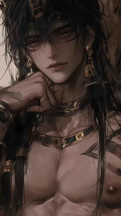 Midjourney Bot 更新时间:2026-02-21 00:172.5D Anime Illustration Thick Paint Style Medium Scene A Handsome Man Young but Rough Feeling Black Skin Gold Vertical Eyes Long Curled Black Hair "M" The bangs on the body (chest, arms, neck) have golden tattoos (with exquisite gilded holy patterns surrounding the Xi Sun totem), and the earlobes have bilateral Xi Tian Yu Jin Wheel earrings (the wheel is as big as the palm of the hand). The neck is adorned with a matte light Xi Jin multi strand necklace pendant, which is a hollow Xi Tian Yu Jin Wheel totem round brand. The left wrist is wrapped in a Sun Sun Gold patterned bracelet, and the left arm is wrapped in a matte Xi Jin wheel arm ring. The facial features are extremely aggressive, and the jawline is sharp like a knife cutting high, the nose bridge is thin, and the lips occasionally evoke a dangerous smile. The hair is fluffy and inverted. The man looks at the camera with his left hand supporting his chin and carrying a hint of danger. Very handsome and handsome (with an ancient Egyptian background) wearing exotic style clothing (silk chest scarf) Require the man's upper body to be completely in the camera (from head to hips) --ar 9:16 --stylize 560 --niji 6 --profile odk9fo3