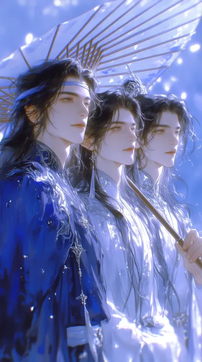 Midjourney Bot 更新时间:2026-02-21 00:18The character on the left is a handsome and handsome man with a profile. His lines are clear and cold, his jawline is sharp, his eyes are frivolous, and his gaze carries a sense of distance. His lip color is light, and his long hair is as black as ink, tied with a light blue headband, and his hair strands fly in the wind. Wearing a deep blue long sleeved robe with delicate iridescent fabric, the collar and shoulders are embroidered with silver white dark patterns. A waist belt of the same color is tied around the waist, and the hanging ribbon is embellished with silver white color scheme. The overall style is heroic, with a sense of nobility in the martial arts world. Standing sideways, the body is slightly tilted, and the gaze is directed towards the person on the right side. The posture is calm, and the clothing technique flies. The right hand protrudes with a semi transparent oiled paper umbrella, with slender ribs and a light blue and silver iridescent luster on the umbrella. There are scattered small spots of light under the umbrella, as if the person on the right is about to move forward. He is a handsome man with ancient style, delicate facial features, handsome face, gender indistinguishable, and cold white delicate skin. Her gaze was gentle yet with a hint of detachment, her lips were pale in color, her long black hair cascading down her waist like a waterfall, her hair was tied in a ponytail, and she wore a delicate silver patterned crown between her hair. Wearing a moon white cross necked wide sleeved robe, the fabric is light and thin with a soft light texture. The collar has a silver cloud patterned buckle, and a white wide waistband is tied around the waist. The overall elegant and ethereal appearance is like a fairy descending to the mortal world. The background is a hazy light blue and blue white gradient, with scattered light spots floating in the air. The overall atmosphere is dreamy and cool, with a pseudo thick coating of ancient style immortal hero style, CG illustrations, ancient style freehand brushwork, 8K ultra high definition, blurred depth of field, clean picture, movie texture, 2.5D dimension --ar 9:16 --c 99 --stylize 840 --niji 7