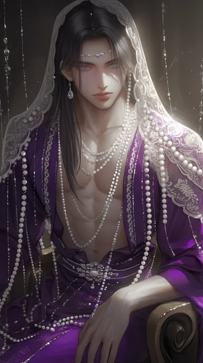 Midjourney Bot 更新时间:2026-02-21 00:1890s Japanese manga anime style, Ottoman Empire court aesthetics, a handsome anime man wearing a violet lace pilgrimage cloth, silver beads and pearls hanging from his shoulders, inspired by silk, adorned with diamonds, and wearing a delicate veil on his face. The top is embroidered with white pearls, and each shoulder has a large number of bead decorations and silver bead tassels extending downwards from both sides. Lace lace hollow out, broken diamond lace, embroidered lotus pattern, gold thread, silver thread, embroidered gold, silver pattern, printed, gilded embroidered phoenix, base fabric dark pattern, long straight hair, fair skin, black long hair, muscular, soft light, sitting on a chair --ar 9:16 --style raw --stylize 100 --niji 6 --no no