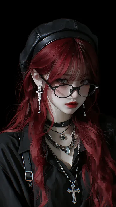 Midjourney Bot 更新时间:2026-02-20 00:37一位亚洲面孔的美少女,酒红色大波浪长发,齐刘海,戴着黑色宽边眼镜,清冷忧郁的眼神,妖冶红唇,精致的五官,厌世感表情,头戴一顶黑色贝雷帽,黑色皮质choker,黑色宽松衬衫,多层银色十字架项链,华丽宝石吊坠项链,长款流苏耳坠,暗黑系朋克风穿搭,纯黑背景,暗调氛围,厚涂插画,写实二次元,细腻笔触,电影感光影,半身特写,略微低头的侧颜,高对比度,氛围感拉满,高清细节,8K。 --ar 9:16 --stylize 334 --niji 7