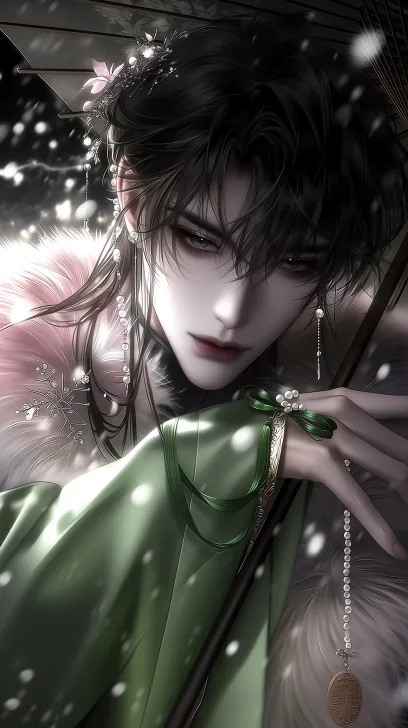 Midjourney Bot 更新时间:2026-02-20 00:37https://images.gogpt.vip/aigf/m_origin/20260216/2058577/ieg3d95h21kkelrk.jpg 2.5d半写实绘画风格百分之六十写实,高清渲染,高级CG质感,精致厚涂,半身照,伪厚涂风格,整体色调偏暗,营造出复古雅致的氛围。街头美学,鱼眼镜头。描绘一个帅气英俊青年男性。蓬松黑长发飘逸柔顺扎成古风双丫鬟配珍珠发饰和小花簪,耳坠点缀。精致帅气洋娃娃的五官。眉眼清晰,睫毛分明,眉毛清晰。晶莹瞳孔。水玻璃唇。皮肤白皙透亮。细闪清透皮肤。冷白皮肤。背景夜晚天空。满是烟花绽放。粉绿拼接传统华丽古风,珍珠装饰,靠近镜头。绿色披风边缘白色毛绒装饰,绿丝带系成蝴蝶结,袖口毛绒,雪松。下雪。手自然抬起,雪花飘落。一手撑黑色油纸伞,边缘悬挂铜钱串。俯拍。抓拍感。氛围感。8K分辨率,高清细节,电影级光影效果,氛围感十足神情随性细腻笔触,近景构图,柔和的光影,近景,面部特写,极致面部特写。精致的细节,优, --ar 9:16 --stylize 100 --iw 0.3 --niji 7 --sref https://images.gogpt.vip/aigf/m_origin/20260216/2058577/ieg3d95h21kkelrk.jpg