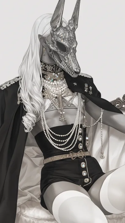 Midjourney Bot 更新时间:2026-02-21 00:07杰作, 顶级品质, 半写实, 电影般的插画,,动漫,清晰,复杂细节,最好的质量,超精细,高细节pixiv插画,画面8K清晰,暗色调,冷色调,天野喜孝风格。80年代和90年代日系漫画动漫风格,长长微卷的白发,一只肌肉发达的拟人化阿努比斯豺狼,穿着黑色指挥官制服和白色长筒袜,身穿披挂、珍珠级联抹胸、镶嵌着宝石、绣着珍珠和莱茵石、挂着链子。银色金属骷髅面具,维多利亚时代,哥特式风格,宽肩细腰,冷白皮,美学细节。白色背景,线条艺术,坐在沙发上 --ar 9:16 --style raw --stylize 100 --niji 6 --no no