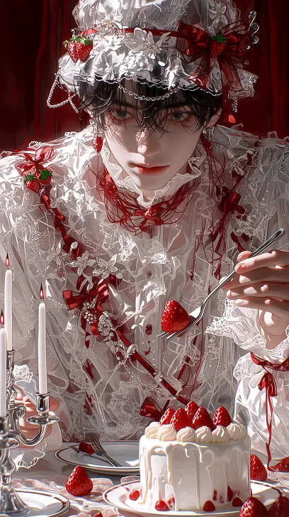 Midjourney Bot 更新时间:2026-02-21 00:08一位精致年轻的男子正面照中景半身像,华丽风,正面视角,展示整个上半身。下垂的眼尾,黑色眼睛,黑色长发搭配长刘海,带着红色的蝴蝶结发饰,带着白色波奈特帽子,上面装饰着红色的蝴蝶结和珍珠链子还有红色草莓装饰,眼神柔软直视镜头,薄唇,嘴唇富有光泽。穿着白色的洛丽塔裙子,上面有繁杂的白色蕾丝和白色花边装饰和红色丝带装饰,层层叠叠,长袖,袖子也是繁杂的白色蕾丝和花边装饰,佩戴红色丝绸项圈,动作是一只手拿着一枚银制的叉子,叉子上面也系着蝴蝶结,角色坐在白色的餐桌前,面前摆着一块草莓蛋糕,(雪白的奶油,鲜红欲滴的草莓,红丝绒的蛋糕胚)。餐桌上还摆着烛台,餐盘,散落的单个草莓,背景是红色的幕布,角色面部清晰,细节丰富,柔和光线聚焦人物面部清晰,温馨氛围。半写实伪厚涂拟真风格,cg渲染。质感柔顺,画面柔和柔软。 --ar 9:16 --seed 18191655 --stylize 1000 --niji 7