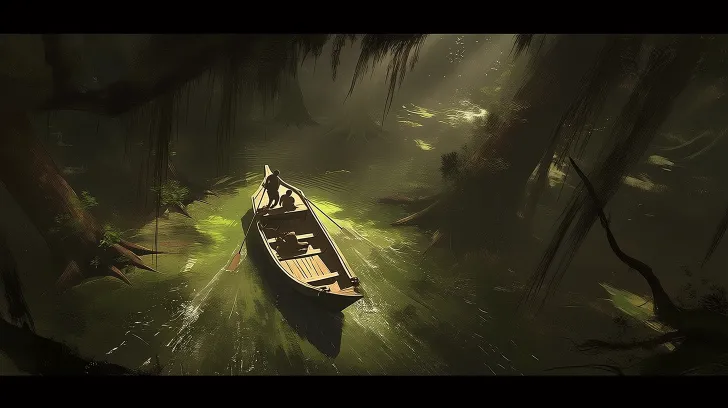 Midjourney Bot 更新时间:2026-02-20 00:34https://images.gogpt.vip/aigf/m_origin/20260220/1843569/h3shyfh566ogy007.jpg A mysterious and atmospheric scene depicts a lonely small boat floating on a water surface covered in green moss. The screen adopts a bird's-eye view, with the hull slightly worn out and people rowing on top. Surrounding is a dense forest, with branches hanging down, creating shadows and a dark environment. The light shines through the tree canopy, creating a mysterious and peaceful atmosphere, as if hiding an unknown story. The overall color tone is dark, green --ar 16:9 --weird 208 --stylize 100 --iw 0.5 --niji 7 --sref https://images.gogpt.vip/aigf/m_origin/20260220/1843569/h3shyfh566ogy007.jpg --sw 534