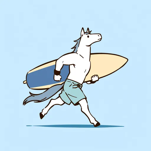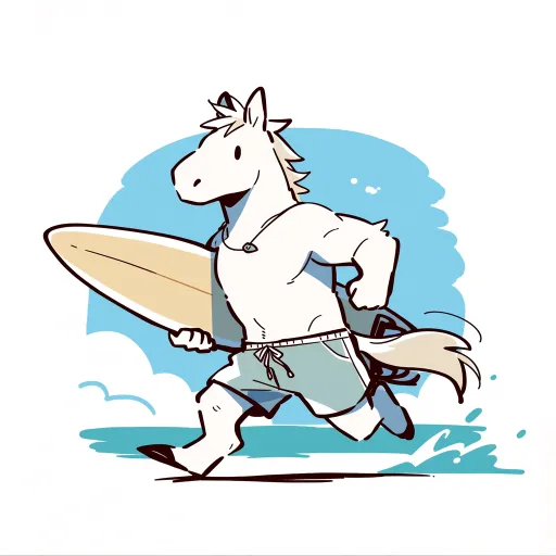 Midjourney Bot 更新时间:2026-02-20 00:36Cartoon hand-drawn illustration, bright colors, simple lines. An illustration of a horse, at the center is a personified slim white horse wearing surf shorts and holding a surfboard while running with big strides, against a sea blue background with soft light and shadows. Comic art style, anime aesthetics, high definition and high quality. --ar 1:1 --stylize 100 --niji 7