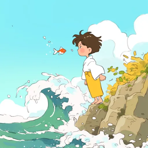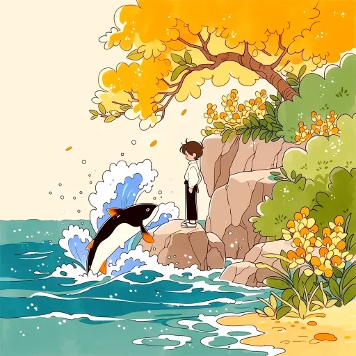 Midjourney Bot 更新时间:2026-02-21 00:04A boy stands by a rocky coastline, the sea surface churning with white waves. Behind him, on the cliff, there is a golden osmanthus tree blooming with small golden flowers. A koi leaps out of the water, its back black and its belly white; the koi should not have red color and can be slightly larger. Miyazaki Hayao style, Makoto Shinkai style, colors, watercolor texture, soft dreamy light and shadow, blue, green, golden tones, cinematic composition, fantastical atmosphere, richly detailed background, 4k, square. Similar to Miyazaki's style, soft watercolor painting, the warm golden sunset contrasts with the cool blue seawater, creating a fantastical and hopeful atmosphere. --ar 1:1 --stylize 100 --niji 7 --sref https://images.gogpt.vip/aigf/m_thumbnail/20260220/2060885/rl3dsdwhe1rwkbvd.webp --no Red