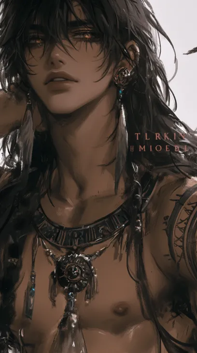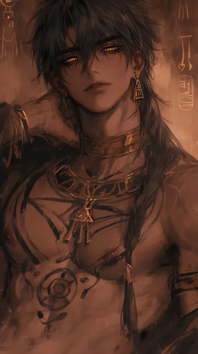 Midjourney Bot 更新时间:2026-02-21 00:012.5D anime illustration thick paint style medium shot a handsome man young but with a rugged feel dark skin golden vertical pupils long black hair "M" shaped bangs (delicate strands of hair with slightly curled ends reaching waist level) his body (chest, arms, neck) has golden tattoos (intricately inked gilded holy patterns winding into a sun totem) earlobes adorned with double-sided sun sky imperial gold wheel earrings (the wheel is palm-sized) neck adorned with matte sun gold multi-strand necklace pendant is a hollow sun sky imperial gold wheel totem round plate left wrist wearing sun sun gold patterned bracelet left arm wearing imperial gold sun wheel arm ring matte sun gold material facial features have an aggressive contour sharp jawline high nose bridge thin lips occasionally curling into a hint of dangerous smile hair is fluffy inverted triangle body shape the man looks at the camera left hand propping up his chin with a hint of danger the man is extremely handsome stylish attractive (Ancient Egyptian background) wearing exotic related style clothing requires the upper body of the man to be completely in the frame (from head to hip) movie-level picture quality daylight lamp --ar 9:16 --style raw --stylize 560 --niji 6 --profile odk9fo3