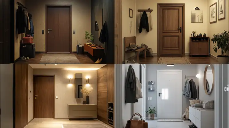 Midjourney Bot 更新时间:2024-08-16 00:03The entrance door, shoe cabinet, and other items are neatly arranged against the wall. There is a folding small mirror on the wall, with an elegant style, and a frontal view of the wall. --v 6.1 --ar 16:9