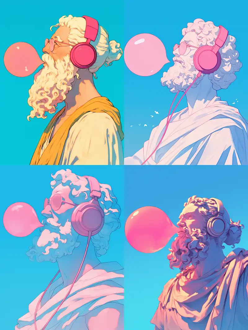 Midjourney Bot 更新时间:2024-08-15 00:01Illustration, a bust of a bearded ancient Roman man looking up at the light blue sky, wearing pink headphones and glasses, blowing a large pink bubble, minimalist image, clean composition. --niji 6 --ar 3:4