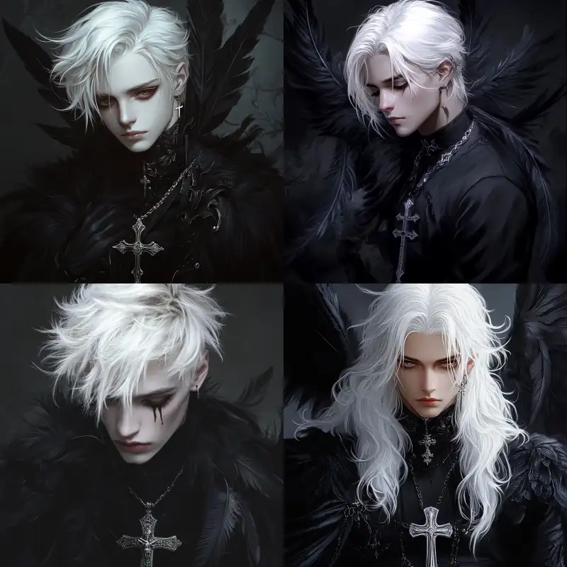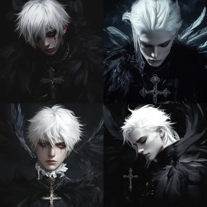 Midjourney Bot 更新时间:2024-08-15 00:02Exquisite Gothic-style avatar, handsome, white hair, cross, dark theme, the image is exquisite and clear, black background, feathers --v 6.1 --ar 1:1
