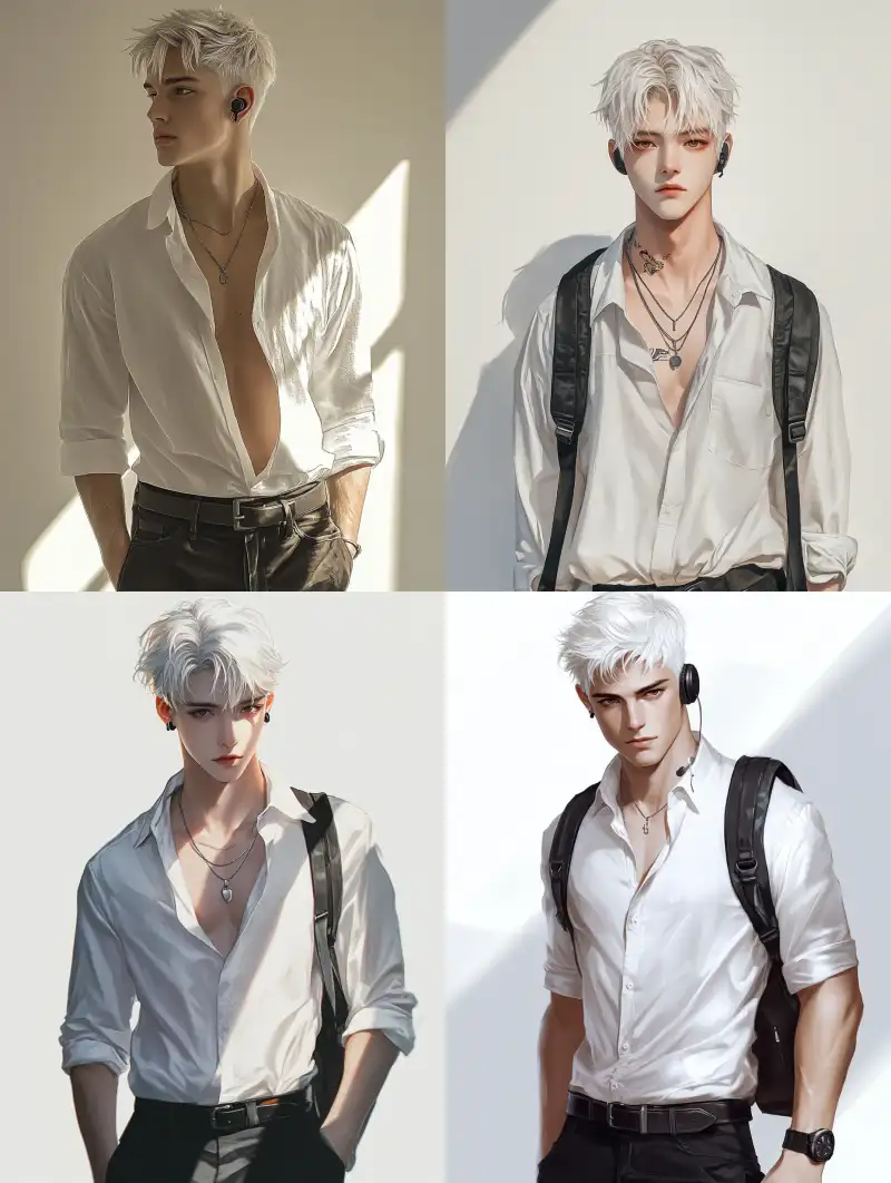 Midjourney Bot 更新时间:2024-08-15 00:03A very handsome boy, 1.88 meters tall, long legs, prominent muscle lines, three-dimensional facial features, thick eyebrows and big eyes, Euro-American male facial contours, short white hair, wearing a black ear stud in his right ear, a silver short necklace around his neck, the first two buttons of his white shirt are unbuttoned, the sleeves of the shirt are rolled up, black casual trousers, half-length/full-length, white background, black over-ear headphones, carrying a shoulder backpack, a beam of light shining on him, the camera is at a low angle from the man's right side, capturing his full body, quiet and beautiful, ultra-realistic, 4K, anime. --v 6.1 --ar 3:4