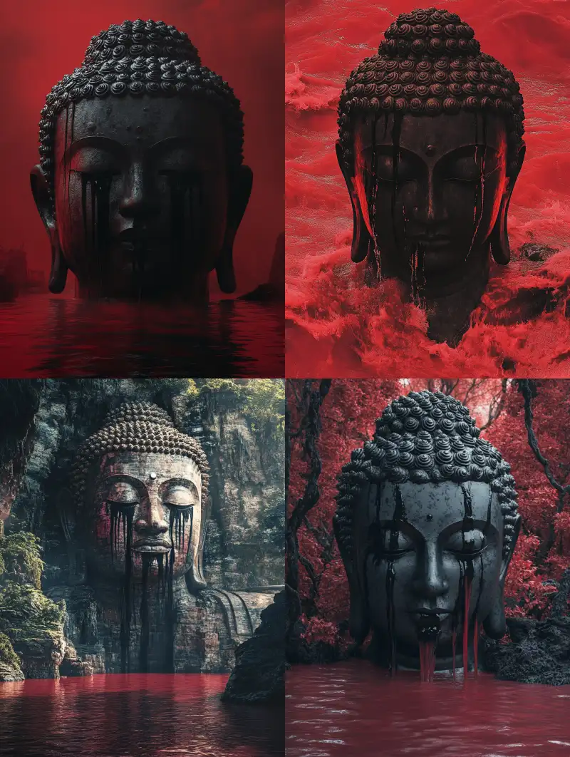 Midjourney Bot 更新时间:2024-08-13 00:09A huge Buddha statue standing in the red river, with black tears streaming down its face, in a realistic style --v 6.1 --ar 3:4 --s 123 --c 13