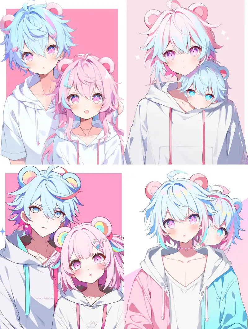 Midjourney Bot 更新时间:2024-08-12 00:11A cute anime boy with light blue hair and a cute anime girl with light blue hair, pink eyes, cute and playful expressions, wearing bear ears on their heads. Digital art adopts a soft pink and cute style, with background images and exquisite --sref