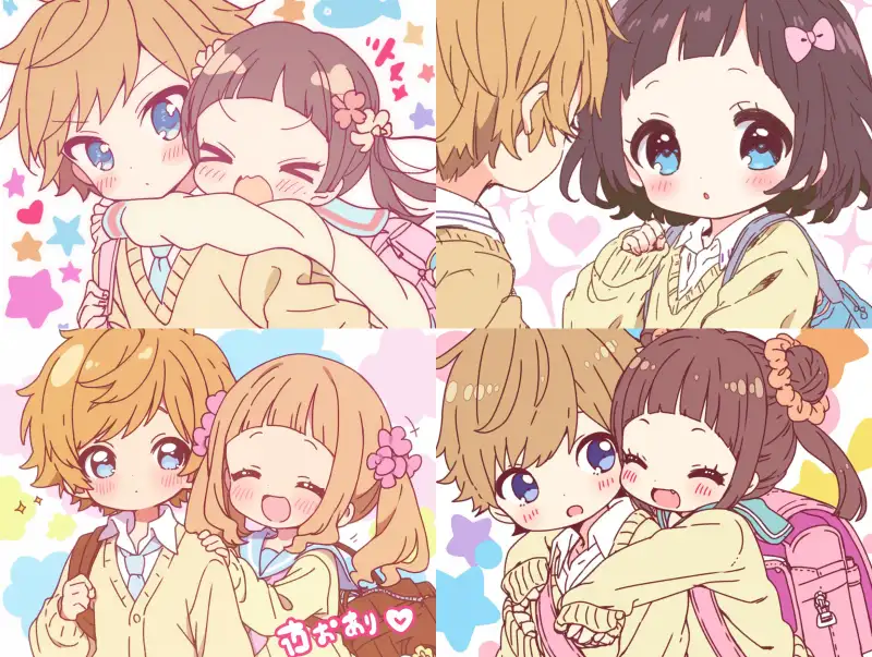 Midjourney Bot 更新时间:2024-08-13 00:01Couple, male with golden hair and blue eyes wearing a white shirt jacket and a yellow knitted sweater, female with black hair and black eyes wearing a sailor suit and carrying a uniform bag, white background high-definition --sref