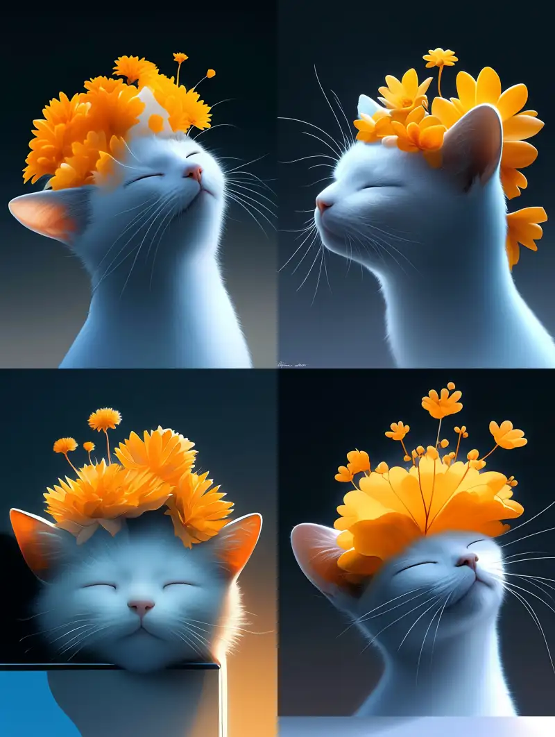 Midjourney Bot 更新时间:2024-08-13 00:02A white cat with yellow daisies on its head, smiling with closed eyes, black background, side view, surreal animal photography, surreal animal illustrations, ethereal portraits, fantasy realism, macro zoom, minimalist background, soft lighting, dreamy atmosphere --sref