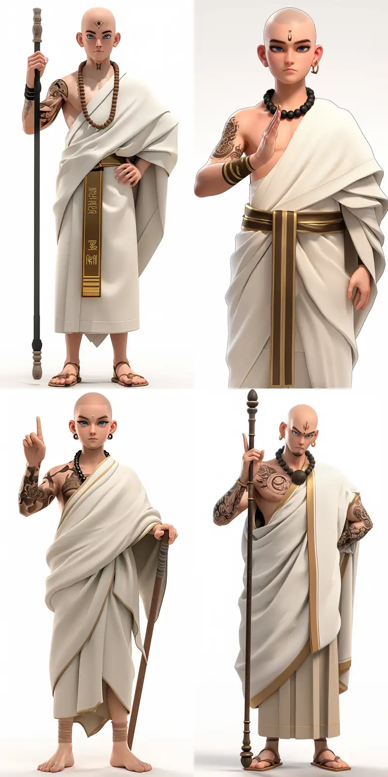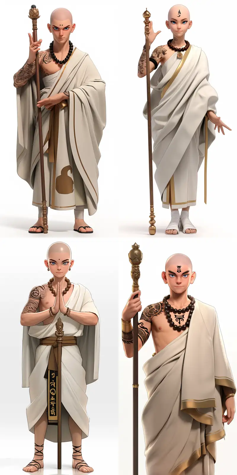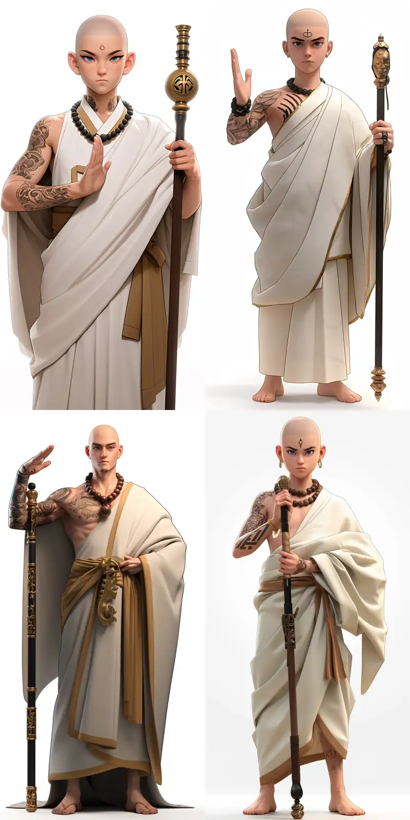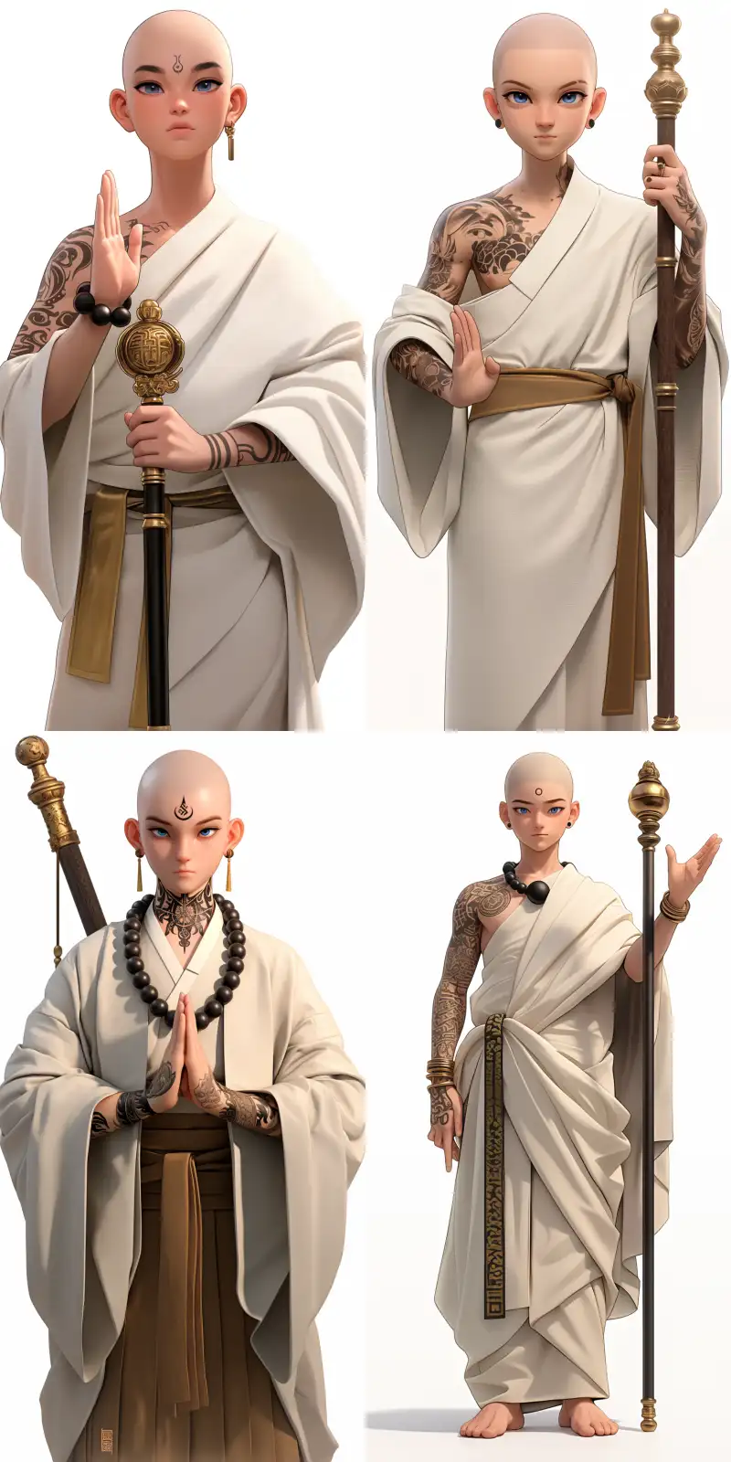 Midjourney Bot 更新时间:2024-08-11 00:16A Korean idol boy with tattoos on his arms, bald head, wearing a white robe with golden stripes, wearing a large Buddha bead on his neck, thick eyebrows, big eyes, blue pupils, bowing with one palm, holding a Zen wand in the other hand, the character standing, front view, high quality, high detail, high resolution, 8K, pure white background, --sref