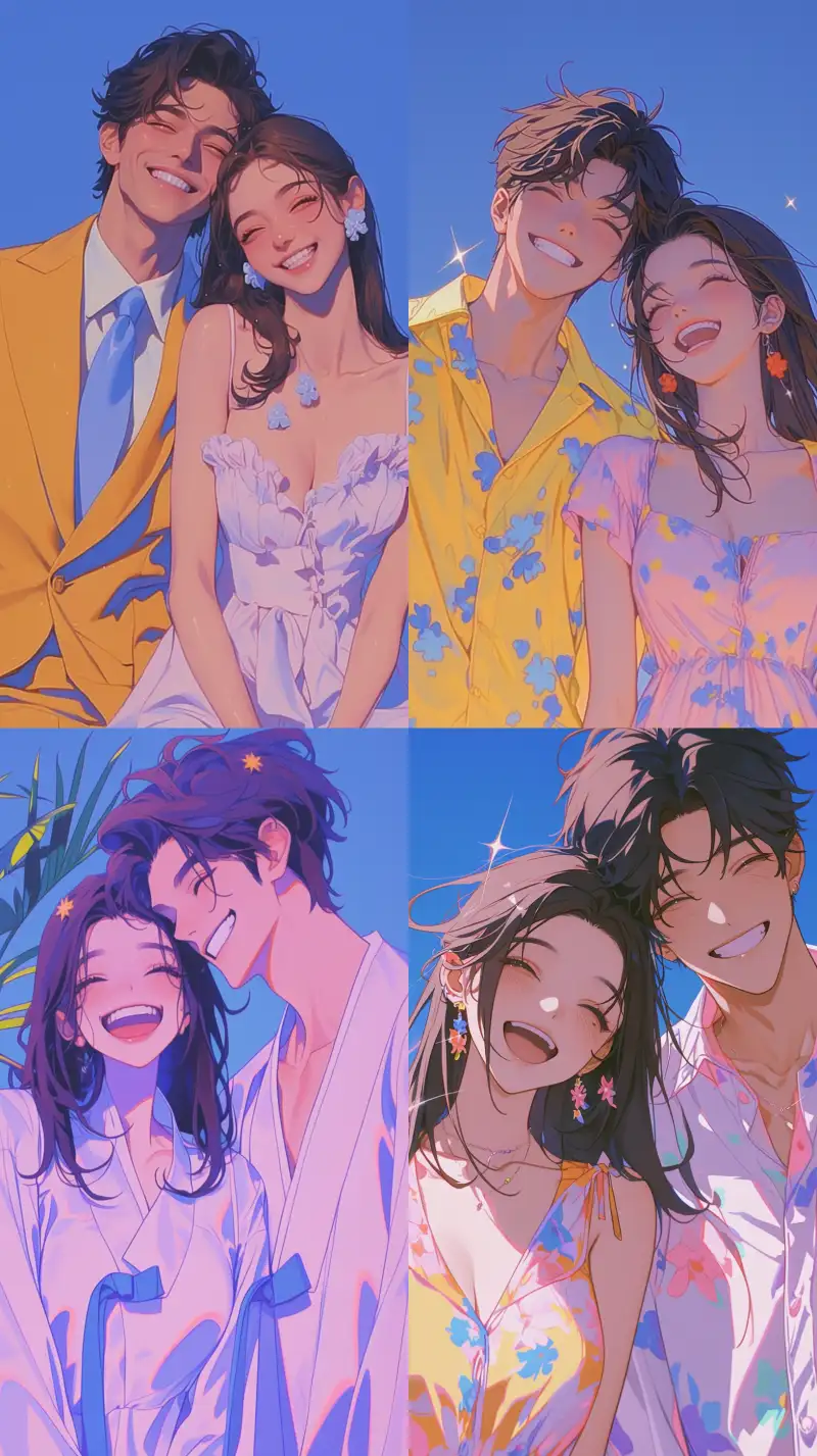 Midjourney Bot 更新时间:2024-08-11 00:11A couple laughing together, looking at the camera, dressed in fashionable Korean style, with a handsome young man with a slightly cropped hairstyle and a beautiful girl with medium length brown straight hair. Against the backdrop of a summer style, they fantasize, colorful, fashionable, complex, and highly detailed, with character concept art, beautiful faces, highly detailed faces, sparkling and dazzling, dynamic angles, high-sensitivity illustrations, masterpieces, 8k, the best quality, perfect surreal composition, and Korean network cartoon animation style animation --niji 6 --ar 9:16 --style raw --sref 1735401690 1999999 --s 1000
