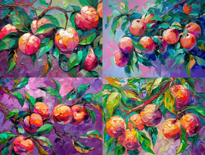 Midjourney Bot 更新时间:2024-08-11 00:17Fresh peaches hanging on tree branches, green leaves, green and purple red, simple solid color background, bright color palette knife, acrylic, thick paint painting, using thick brushstrokes, thick oil painting, texture painting, high-definition picture quality, scraper painting, relief, three-dimensional, abstract, textured --sref