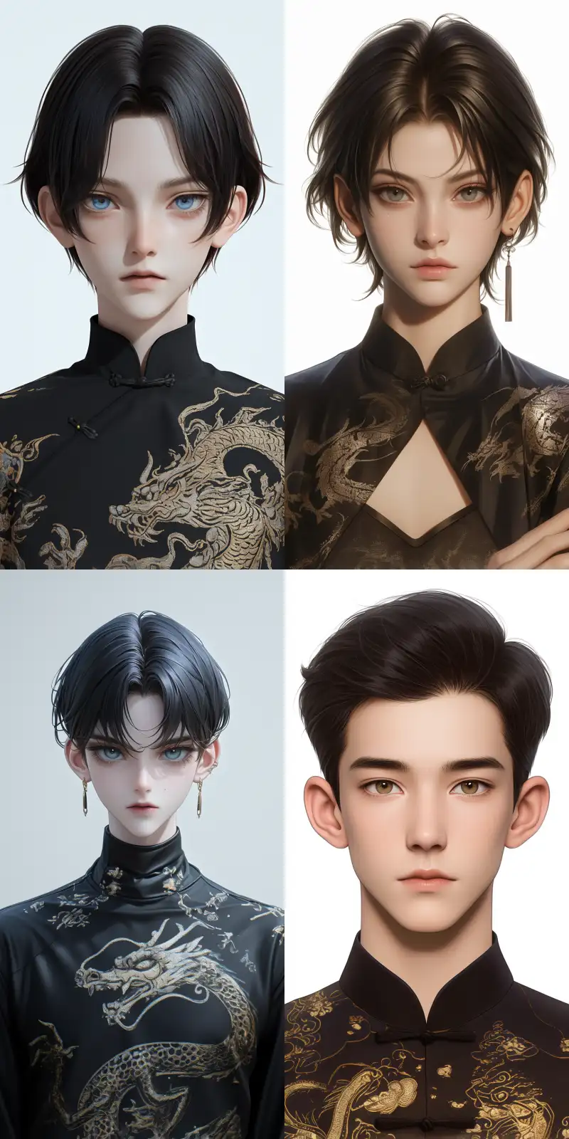 Midjourney Bot 更新时间:2024-08-07 00:10A cool and handsome boy with short black hair, wearing a modern black cheongsam, with textured skin, delicate facial features and makeup, standing character, front view, half body photo of character, very detailed and realistic, professional photography, high quality, high detail, high resolution, 8K, pure white background, --niji 6 --ar 1:2 --s 297 --c 3