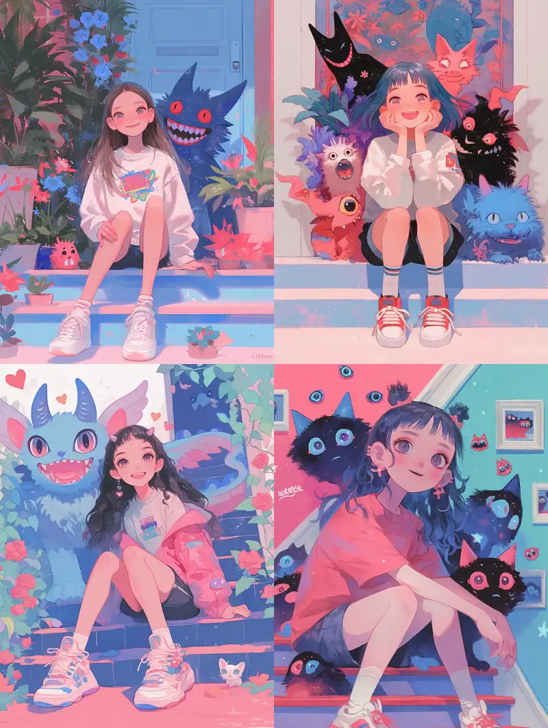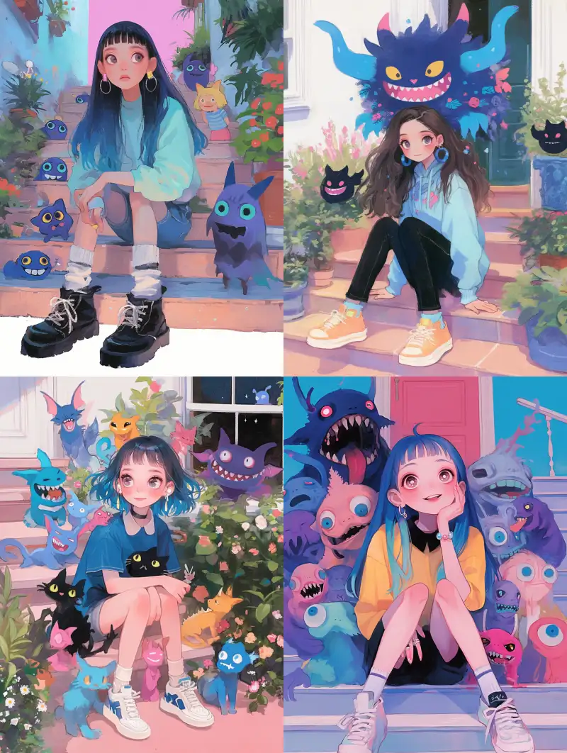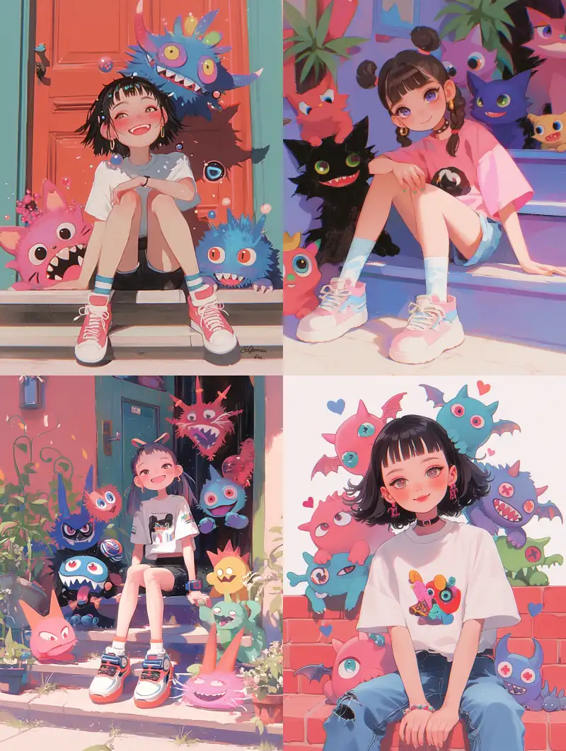 Midjourney Bot 更新时间:2024-08-06 00:10A cute girl sits on the steps with adorable big eyes and a happy face, with the head of her monster pet behind her. Surrounded by many cartoon characters, this style features comic illustrations, light green and dark blue tones, full body portraits, exaggerated expressions, fantasy elements, and joyful emotions. The background is filled with rich and colorful cartoon elements. Clear lines, flat design style, giving people a pleasant feeling. The overall color scheme features bright colors and soft tones. High resolution comic illustration style, this is a full body portrait, ultra detailed --niji 6 --ar 3:4 --sref 1914793341::1 277843058::1 3139460395::1 20240727::1 499::1 3691268207::1 40912299::2 39014934::1 --s 1000