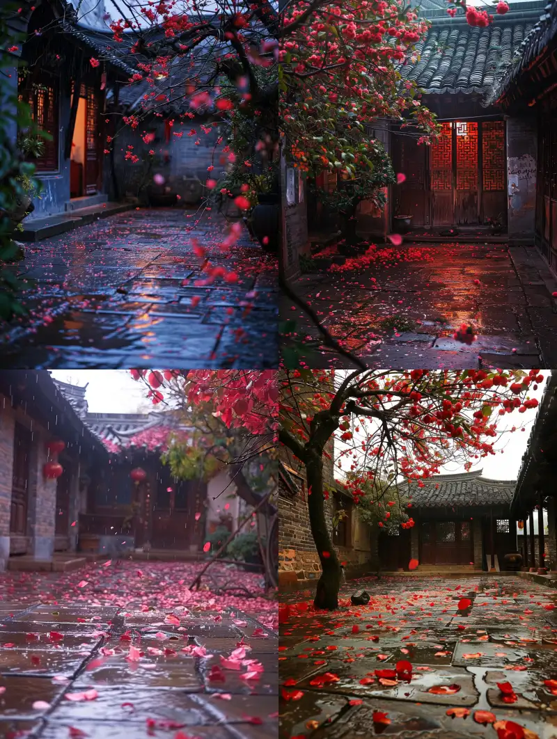 Midjourney Bot 更新时间:2024-08-06 00:03Loess Plateau, Hongdong, after rain, in the evening, there is a faint light in the courtyard, a damp bluestone floor, a crabapple tree in the courtyard, red petals falling all over the ground, high-altitude overhead effect, clear picture quality, high-definition image, camera shooting effect --v 6.0 --ar 3:4